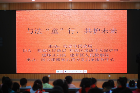 2021年10月27日下午,为更好地落实新颁布的《中华人民共和国民法典》、《中华人民共和国未成年人保护法》和《中华人民共和国预防未成年人犯罪法》, 南京市民政局联合建邺区妇联,建邺区检察院,建邺区未成年人保护中心主办,由喇叭花关爱儿童服务中心承办,在南湖二小举办了一堂生动的法治宣传课。